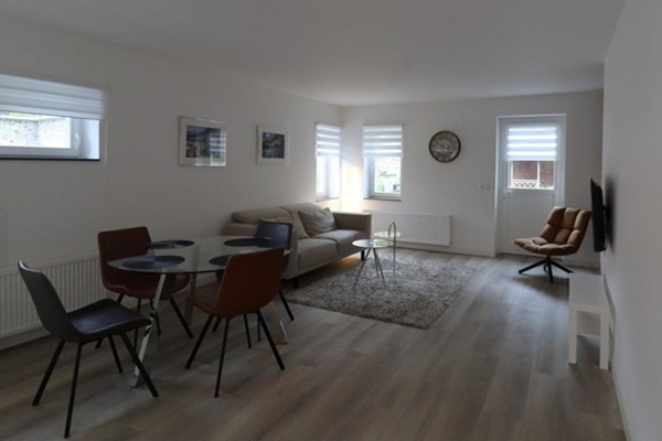 De ingang van het appartement bevindt zich op de begane grond. Deze geeft toegang tot een bureau/werkruimte. Op de begane grond is verder een toilet alsook de aansluiting van de wasmachine aanwezig. Op de eerste etage bevindt zich de zeer ruime woonkamer met open keuken. Deze is volledig uitgerust met een vaatwasser, inductiekookplaat, afzuiging, koelkast, vriezer en oven. Verder bevinden zich op de eerste etage 2 gelijkwaardige slaapkamers, de ruimte badkamer, toilet & tenslotte de toegang tot de ruime stadstuin van ongeveer 150 vierkante meter.