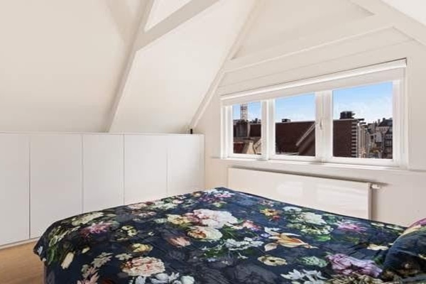 NIET GESCHIKT VOOR WONINGDELERS! Indeling: Tweede verdieping: entree, met smallere trap naar de derde verdieping. Derde verdieping: doorzon woonkamer met houten vloer, open keuken (in modern wit uitgevoerd en v.v. diverse inbouwapparatuur) en toegang tot het zonnige dakterras. Werk/slaapkamer aan de grachtzijde, die eventueel ook dienst kan doen als tweede slaapkamer. Trap naar de kapverdieping. Vierde verdieping: riante slaapkamer van bijna 20m2 met kledingkasten en toegang tot het uitschuifbare balkon (Velux). Naastgelegen badkamer met ligbad, toilet, douchehoek, dubbele wastafel en kastruimte. De badkamer kent een hoog afwerkingsniveau en is recent gemoderniseerd; de vloerverwarming zorgt voor extra comfort. De kapverdieping is uitgerust met een airco-installatie.