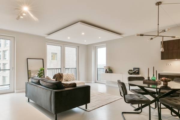 Indeling De gemeenschappelijke entree sluit aan op een gang waar zich de lift bevindt. Het appartement zelf is gelegen op de vierde verdieping. Bij binnenkomst in het appartement bevindt zich aan de rechterkant een kapstok en de ruimte loopt over in de open woonkamer en keuken. De keuken beschikt over een compleet assortiment inbouwapparatuur zoals een koelkast, aparte vriezer, goede oven, inductiekookplaat en een vaatwasser. Ook de basics als een waterkoker, bestek en pannen plus pannen zijn aanwezig.