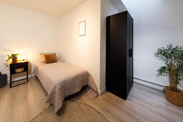 Indeling : Dit appartement ligt op de begane grond en is gelijkvloers. Je kijkt uit op een gezellige straat met nieuw gerealiseerde woningen. Entree, 2 slaapkamers (ca. 12 en 13 m2), lichte woon-kamer (ca 29 m2) met prachtige glas en loodramen en een open keukenruimte voorzien van in-ductieplaat, afzuigkap, oven, koelkast met vriesvak. De badkamer is voorzien van een vaste was-tafel en een douche. Het appartement heeft ook een afzonderlijk toilet. Het appartement is voor-zien van een mooie lichte laminaatvloer.