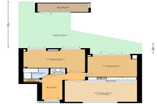 Indeling: Het appartement heeft een eigen entree en is gelegen op de begane grond. De hal biedt toegang tot de ruime woonkamer en keuken, beide aan de voorzijde van het appartement. De keuken is uitgerust met moderne apparatuur, zoals een inductiekookplaat, oven, vaatwasser, koelkast en aparte vriezer. Beide slaapkamers zijn zeer ruim en grenzen aan de tuin van het huis die ook een royale afmeting heeft. Achterin de tuin is een berging. De douche bevindt zich aan de linkerkant van het huis en heeft twee wastafels en ruimte voor een wasmachine en droger. Er is een separate toilet. Woning is geschikt voor delers.