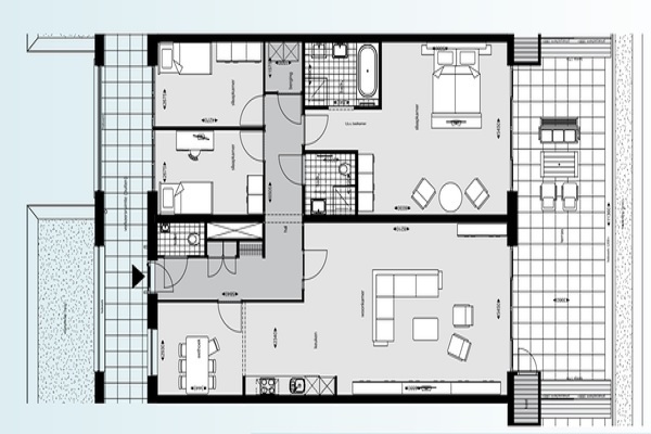 De woning heeft een woonoppervlakte van 153 m². U komt binnen in de hal die toegang geeft tot alle kamers. In de hal is het eerste toilet met fonteintje. De woning beschikt over een zeer ruime woonkamer met een open keuken en aansluitend een eetkamer van 9m2. De keuken is voorzien van koelkast, inductiekookplaat, vaatwasser, afzuigkap en combimagnetron. Allemaal inbouw. De grote slaapkamer heeft een eigen badkamer met ligbad, dubbele wastafel en aparte douche. De twee andere slaapkamers kunnen gebruik maken van d etweede badkamer met douche, toilet en wastafel. Er is teven een heel ruim terras met schuifpui. Er is een gemeenschappelijke binnentuin. Alleen geschikt voor maximaal twee werkende woingsdelers;
