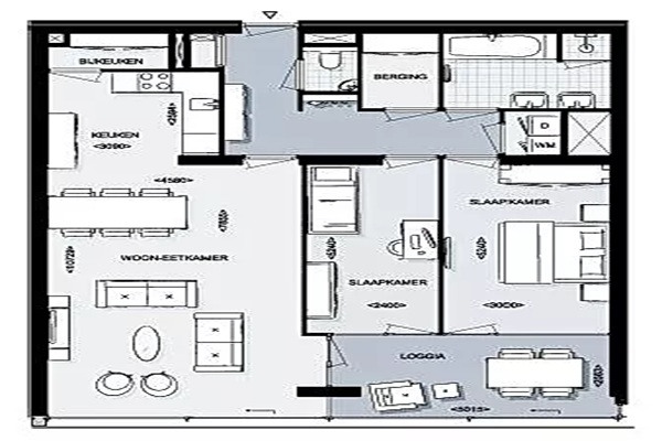 Bij binnenkomst word je direct verwelkomd in een royale hal die toegang biedt tot de verrassend ruime woonkamer. Enorme raampartijen en openslaande deuren laten het daglicht rijkelijk binnen en creëren een prachtig panorama. De open, moderne keuken is volledig uitgerust met hoogwaardige inbouwapparatuur en vormt de perfecte plek om te koken en te genieten van een diner met uitzicht. Het appartement beschikt over twee comfortabele slaapkamers, ideaal als masterbedroom, logeerkamer of werkruimte. De eigentijdse badkamer is voorzien van een ligbad en aparte douche, en daarnaast is er een separaat toilet voor extra gemak.