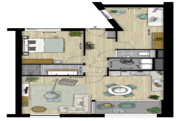 Entree, via de hal betreed je de lichte woonkamer met loggia en open keuken voorzien van inbouwapparatuur. De badkamer is voorzien van een wastafel en een inloopdouche. Het appartement beschikt over 2 slaapkamers. Tevens is er een aparte wasruimte en een apart toilet met fontein aanwezig. In de kelder is ook nog een fietsenberging gevestigd.