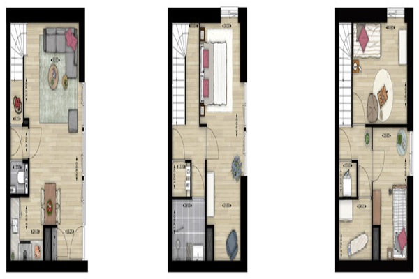 Indeling: Kom binnen in een lichte living met grote glazen pui, moderne open hoekkeuken voorzien van inbouwapparatuur zoals 4 pits kooktoestel, koelkast, combi magnetron en vaatwasser. Daarnaast is er een apart toilet met fontein en kleine berging aanwezig. Via de vaste trap bereik je de 1e verdieping waar zich een compleet afgewerkte badkamer met inloopdouche, een royale slaapkamer en de stookruimte bevindt. Neem je nogmaals de trap naar boven dan treft je daar 2 extra slaapkamers en een handige bergruimte aan.