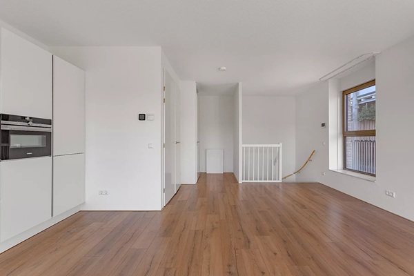 De woning is speels ingedeeld over twee verdiepingen, wat direct zorgt voor een verrassend ruimtelijk gevoel. Op de woonverdieping vind je een fijne, open leefruimte waar koken, eten en ontspannen moeiteloos in elkaar overlopen. De grote raampartijen zorgen voor veel daglicht en geven de woonkamer een prettige, open sfeer. De keuken sluit mooi aan op de ruimte en is een gezellige plek om te koken terwijl vrienden of familie aanschuiven aan de eettafel. Een verdieping lager bevinden zich de entree, de berging en de badkamer. Dankzij de slimme indeling voelt iedere vierkante meter logisch en comfortabel aan. Of je nu alleen woont, met z’n tweeën of gewoon graag wat extra ruimte hebt om thuis te werken, dit appartement past zich moeiteloos aan jouw woonwensen aan.