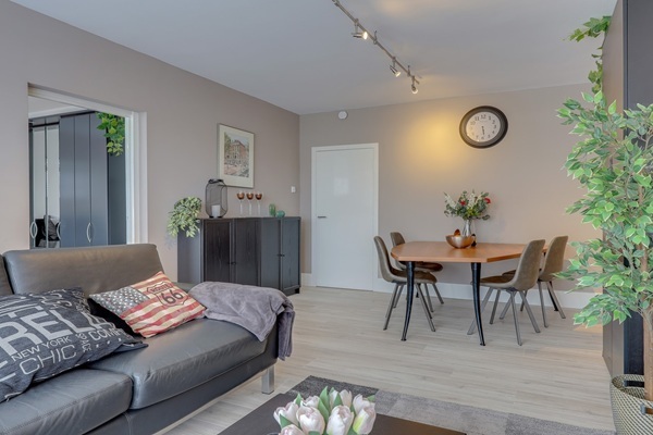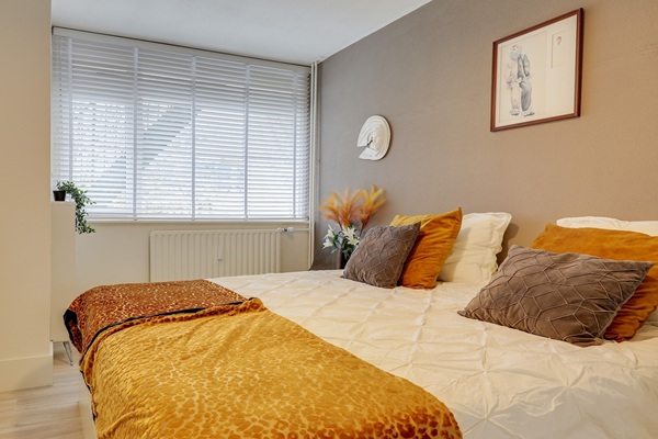 Indeling Gezamenlijke entree met bellentableau, brievenbussen, trapopgang en 2 liften. Ook bevindt zich hier een berging. Overige verdiepingen 3e verdieping: Entree voorzien van laminaat, gang met meterkast, toilet, keuken, 4 kamers, waarvan twee met toegang tot het balkon, badkamer met douche, vaste wastafel en aansluitvoorzieningen voor de witgoedmachines. Het gehele appartement is voorzien van jaloezieën, behalve in de keuken. De woonkamer en eethoek zijn volledig ingericht en voorzien van smart tv, internet en strakke wand- en plafondafwerking. Tevens geniet de woonkamer van veel lichtinval en is voorzien van een zonnescherm. Ook geniet u hier van een vrij uitzicht. Vanuit de woonkamer heb je toegang tot het balkon welke gelegen is op het zuiden. De landelijke woonkeuken is groot en van alle gemakken voorzien. Namelijk een 4-pits inductiekookplaat, RVS afzuigkap, oven, koelkast en vriezer, vaatwasser en alle inventaris die u nodig hebt in de keuken. De keuken is voorzien van een tegelvloer en beschikt over elektrische rolluiken. Vanuit de woonkamer heeft u toegang tot deze luxe slaapkamer die ook voorzien is van laminaat en een rolluik. Vanuit de hal heeft u toegang tot de slaapkamer welke gelegen is aan de voorzijde. Tevens voorzien van een laminaatvloer, een rolluik en jaloezieën. De half betegelde (mozaïek tegels) moderne badkamer is uitgerust met een inloopdouche met thermostaatkraan en vaste wastafel met wastafelmeubel. Balkon Zowel de woonkamer als slaapkamer aan de achterzijde biedt toegang tot het balkon welke gelegen is op het Zuiden en voorzien is van vlonders en kunstgras. Tevens hangt hier een zonnescherm en geniet u van een mooi uitzicht.