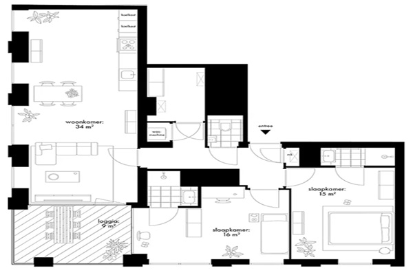 Deze woning betreft een FRIENDSWONING, dus je huurt het appartement samen met familie, een collega of friend. Samen deel je de royale living met open keuken en het ruime balkon. En het toilet en de berging met de aansluitingen voor de wasmachine en wasdroger. Daarnaast heb je een eigen royale slaapkamer met ensuite badkamer die is ingedeeld met een wastafel en douche.