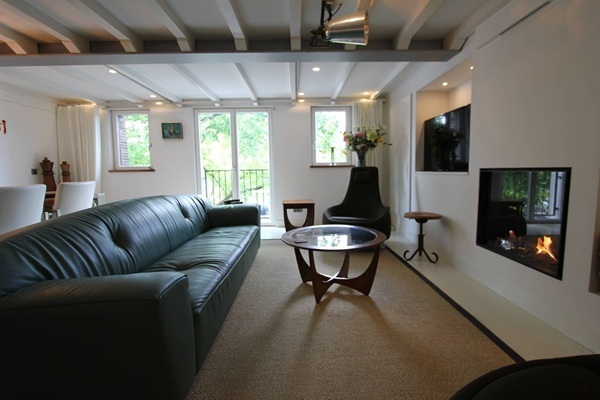 Indeling 2e verdieping, grote en brede hal, zeer ruime en lichte woonkamer met gezellige open haard, designmeubels, Frans balkon met uitzicht op het kanaal, luxe open keuken met alle inbouwapparatuur (ingebouwde, vaatwasser, oven, magnetron, stoomoven en inductiekookplaat). Apart toilet, luxe badkamer met ligbad, douche, dubbele wastafel en tv. Ruime slaapkamer met thuiskantoor, tweepersoonsbed, Frans balkon, tv en inloopkast.