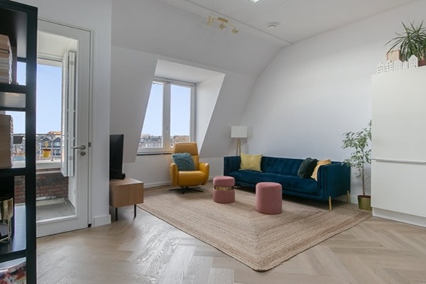 Indeling: Via de gedeelde trap en/of de lift bereikt u de 4e verdieping van dit luxe complex. Via de eigen voordeur komt u in de ruime hal. Vanuit deze hal heeft u toegang tot alle kamers in het appartement. In het plafond bevindt zich een lichtkoepel met verlichting voor de avonden; overdag zorgt deze voor veel daglicht. De ruime woonkamer is zeer licht dankzij de piramidevormige koepel en de hoge plafonds van 3,30 meter. Deze kamer loopt over in de luxe, volledig uitgeruste, open keuken met een breed aanrechtblad. Het appartement beschikt over een zeer romantisch balkon (loggia) dat afgesloten kan worden met metalen rolluiken. Vanaf hier heeft u uitzicht op het Funenpark, de Cruquiuskade, de gracht met brug, de Molen-Brouwerij 't IJ en de skyline van Amsterdam! Verder zijn er 2 ruime slaapkamers. De hoofdslaapkamer heeft een tweepersoonsbed en een kledingkast. De tweede slaapkamer blijft leeg, zodat de huurder deze als thuiskantoor kan gebruiken. De luxe badkamer is voorzien van een ligbad, inloopdouche, toilet en wastafel. Een wasruimte/berging met wasmachine en droger maakt dit appartement compleet.