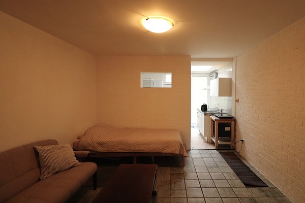 De ruimte is ingericht met een eenpersoonsbed, bank, twee stoelen en diverse opbergmeubels. De studio is ingedeeld in een woon-/slaapgedeelte en een keuken-/badkamerruimte. De keuken is uitgerust met een tweepits elektrische kookplaat, koelkast, oven, afzuigkap en voldoende opbergruimte. Bestek, kookgerei en servies zijn aanwezig. De wasmachine staat in de gedeelde entree/hal. Via de studio heeft u directe toegang tot de gedeelde tuin. Supermarkten en openbaar vervoer liggen op 3 minuten fietsen; het ziekenhuis op 8 minuten. Geschikt voor één werkende of studerende huurder (geen koppels).