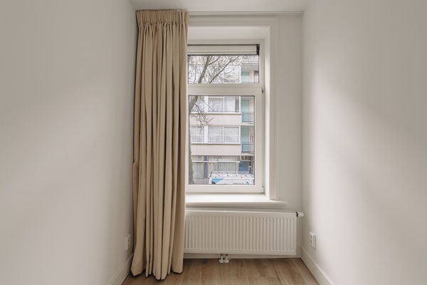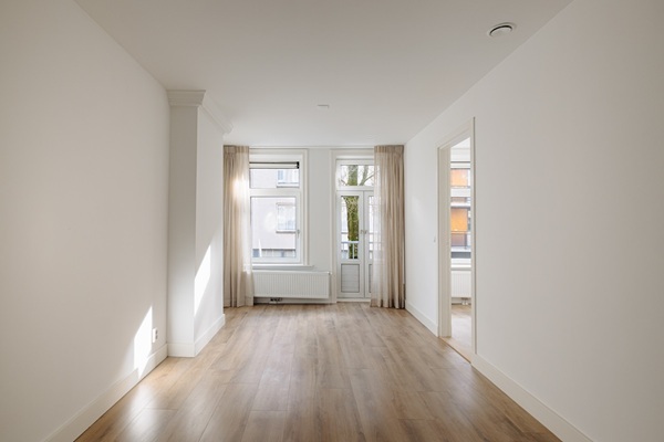 Entree op de eerste verdieping naar de gesloten keuken met toegang naar het balkon. Separaat toilet en wasruimte. Hal naar de woonkamer, badkamer met dubbele wastafel en douche en ruime slaapkamer aan de achterzijde van de woning. De keuken is voorzien van diverse inbouwapparatuur, zoals vaatwasser, afzuigkap en oven. Tweede slaapkamer aan de voorzijde van het appartement, bereikbaar door de woonkamer.
