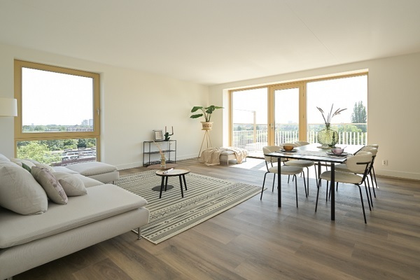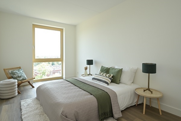 Indeling van het appartement Het aangeboden appartement bevindt zich op de tweede verdieping en is bereikbaar per lift of trap. De woning is volledig nieuw, modern afgewerkt en ontworpen met oog voor wooncomfort en duurzaamheid. Bij binnenkomst via de entree “Bordewijk” word je verwelkomd in een ruime hal die toegang biedt tot: –een apart toilet –een interne berging met aansluitingen voor wasmachine en droger –een luxe badkamer met moderne afwerking –twee comfortabele slaapkamers –een royale en lichte woonkamer met open keuken –ruim en zonnig terras De woonkamer biedt toegang tot een zonnig balkon op het zuiden, waar je heerlijk buiten kunt zitten en genieten van de zon.