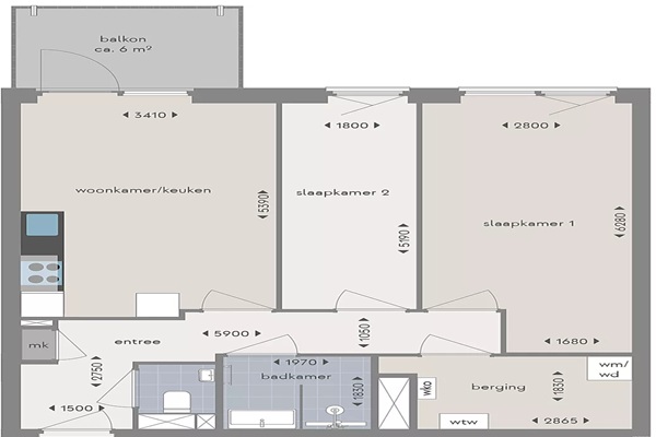 Dit appartement beschikt over een functionele en efficiënte indeling met een ruime woonkamer en open keuken. De woonkamer heeft direct toegang tot het balkon van circa 6 m², wat zorgt voor extra buitenruimte. De keuken is praktisch opgesteld en voorzien van de benodigde aansluitingen. De woning telt twee slaapkamers, beide geschikt voor gebruik als slaap-, werk- of logeerkamer. De badkamer is centraal gelegen en voorzien van douche en wastafel. Daarnaast is er een separate toiletruimte. In de woning bevindt zich een interne berging met aansluitingen voor wasmachine en droger, evenals ruimte voor extra opslag. De entree biedt toegang tot alle vertrekken. Afhankelijk van het woningtype kan de keukenopstelling afwijken en kan de aanwezigheid van een vaste kast verschillen. Afmetingen en indeling zijn indicatief.