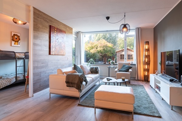 Indeling Begane grond Bij binnenkomst treft u een nette entree met tegelvloer, een gang met meterkast en een separate toiletruimte voorzien van fonteintje. Vanuit hier heeft u toegang tot de overige leefruimtes. Woonkamer De doorzon woonkamer is stijlvol afgewerkt met een laminaatvloer, strakke wand- en plafondafwerking en voorzien van rolluiken. Dankzij de grote raampartijen geniet u van veel natuurlijk licht en een fraai uitzicht op de ruime achtertuin. De woonkamer is volledig ingericht en beschikt over een smart-tv en internet. Keuken De open keuken is van alle gemakken voorzien en uitgerust met een 4-pits gaskookplaat, RVS afzuigkap, oven, koel-vriescombinatie, vaatwasser en complete keukeninventaris. Een ideale plek voor kookliefhebbers! Slaapkamer 1 Vanuit de woonkamer bereikt u de kleinere slaapkamer, voorzien van laminaatvloer en rolluik. Slaapkamer 2 De ruime hoofdslaapkamer bevindt zich aan de voorzijde van de woning en is bereikbaar via de hal. Deze kamer beschikt over een laminaatvloer, rolluik en directe toegang tot de badkamer. Badkamer De badkamer is uitgerust met een wastafelmeubel met lades, een ligbad met douchewand en wasmachine. Berging Een extra inpandige berging in het appartementencomplex. Tuin Verrassend royale tuin – maar liefst 40 m² – gelegen op het oosten. Niet alleen de tuin zelf, maar ook de schuur die erbij hoort, is een groot pluspunt. Bovendien loop je zo via de eigen achterom de tuin in – wel zo makkelijk als je snel je fiets wil pakken of boodschappen naar binnen wilt brengen.