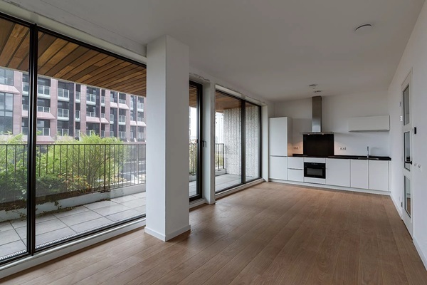 De entree vormt het hart van het appartement en verbindt alle vertrekken op natuurlijke wijze met elkaar. Direct naast de hal liggen een praktische berging en een aparte wasruimte – ideaal om het huis altijd opgeruimd te houden. De badkamer is royaal en luxe uitgevoerd, met zowel een inloopdouche, plus een dubbele wastafel die het geheel een achtige sfeer geeft. Het toilet bevindt zich apart, wel zo comfortabel. Via de hal bereik je de slaapkamer. De slaapkamer is perfect als rustige master met plek voor een groot bed en extra kastruimte. De woonkamer en keuken vormen samen een royale leefruimte waar licht van meerdere kanten binnenkomt. De open keuken is stijlvol en volledig uitgerust, perfect voor zowel snelle ontbijtjes als lange avonden koken met vrienden. Dankzij de open indeling blijf je altijd in contact met wat er in de woonkamer gebeurt. En dan het buitenleven: via de brede schuifpui stap je zo de riante buitenruimte op. Groot genoeg voor een eettafel, loungestoelen en planten – een rustige plek om te ontbijten in de zon of ’s avonds nog even na te genieten van de dag.