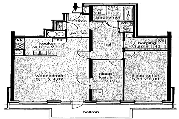 Via de entree kom je in de centrale hal die toegang geeft tot alle vertrekken. De ruime woonkamer biedt volop mogelijkheden voor een comfortabele zithoek en een gezellige eethoek. Grote ramen zorgen voor veel daglicht en via de deur stap je zo het balkon op – een fijne plek om te ontspannen en te genieten van de buitenlucht. De aparte keuken is efficiënt ingericht en biedt voldoende werk- en opbergruimte. Dankzij de slimme indeling is koken hier zowel praktisch als prettig. Het appartement beschikt over twee slaapkamers. De royale hoofdslaapkamer biedt alle ruimte voor een groot bed en kastruimte. De tweede kamer is perfect als kinder-, werk- of logeerkamer. De badkamer is voorzien van een ligbad en wastafel, met een separaat toilet voor extra comfort. Daarnaast is er een handige inpandige berging met aansluitingen voor de wasmachine. Een comfortabele woning met een doordachte indeling, veel licht en een heerlijk balkon – een plek waar je je direct thuis voelt.