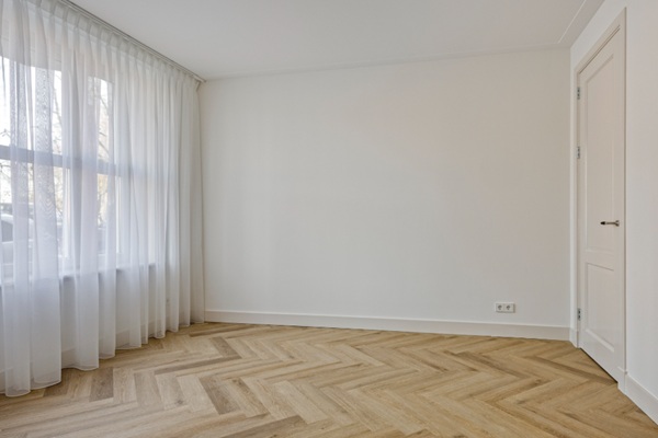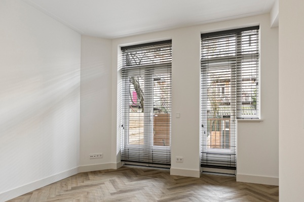 Aan de achterzijde van het appartement bevindt zich de lichte woonkamer met moderne open keuken. Deze keuken is volledig uitgerust met een inductiekookplaat, koel-/vriescombinatie, vaatwasser, combi-oven en afzuigkap, waardoor koken hier een plezier is. De woonkamer vormt een uitnodigende leefruimte en dankzij de dubbele openslaande deuren loopt de binnenruimte naadloos over in het terras en de royale tuin van ongeveer 50 m². De tuin ligt gunstig op het zuidoosten, waardoor er volop wordt genoten van de ochtend- en middagzon. Achter in de tuin bevindt zich bovendien een praktisch schuurtje voor extra opbergruimte. Centraal in de woning bevindt zich de fraai afgewerkte badkamer, voorzien van een comfortabele regendouche, een dubbele wastafel met meubel en een handdoekradiator. Verder is er een separaat toilet en een interne berging met aansluiting voor de wasmachine. Niet mogelijk voor studenten om te huren