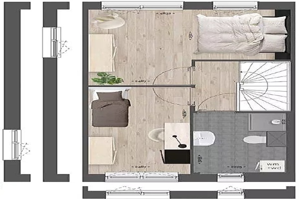 In de hal aan je rechterkant zie je drie deuren en de trap. De eerste deur geeft toegang tot de technische ruimte. De tweede deur is van de meterkast en de derde leidt naar het toilet (uiteraard hangend en met een fonteintje). Van hieruit loop je naar de woonkamer. Een fijne lichte ruimte met deur naar de eigen terras van 20m2. Want ook deze woning heeft zowel voor als achter plek om buiten te zitten. Van hieruit is je uitzicht groener dan groen. Geen buren te zien! De moderne keuken aan de voorzijde van de woning heeft een lichte kleurstelling en moderne grepen. Hij is van alle gemakken voorzien. Je kookt uiteraard op inductie want de woning is all-electric. Verder tref je hier een inbouw combimagnetron, een geïntegreerde vaatwasser en afzuigkap. Vanuit de keuken heb je goed zicht op de gezelligheid van je buurt. De grote pui heeft ramen tot de grond. Wie de trap naar boven neemt, zal verrast worden door de twee ruime slaapkamers. De masterbedroom kreeg een royale afmeting van 14,6 m2. Je hebt hier alle ruimte om de kamer meerdere functies te geven; slaapkamer, werkkamer, kleedkamer. Het kan allemaal! De tweede slaapkamer mag er ook zijn met 10,8 m2. Tenslotte is er nog de ruim opgezette badkamer (6,7 m2). Functioneel en netjes ingericht met een wastafel met kraan, spiegel en glazen planchet, een glazen douchewand, handdouche met glijstang en een elektrische wandradiator. Ook is er plek voor de wasmachine en eventueel de droger. Het hangende toilet krijgt een glazen achterwand, wel zo hygiënisch. De bergingen zijn in groepjes geplaatst in de buurt van de woning. Hier kun je je fiets kwijt. Je auto zet je op een van de gemeenschappelijke parkeerplaatsen aan de rand van de kamer. Je ziet hier alleen maar fietsen, want de kamers zijn autovrij. Wel zo veilig voor de kinderen die hier zorgeloos kunnen spelen. Auto’s staan bij elkaar op een van de parkeerplaatsen aan de rand de kamer.
