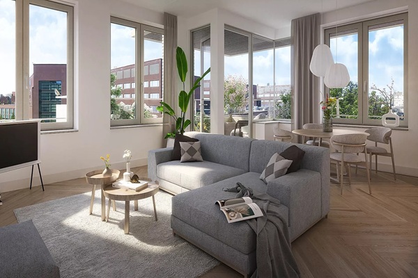 Vanuit de woonkamer is er toegang tot het balkon, dat voldoende ruimte biedt voor een zitje. De slaapkamer is van goed formaat en biedt plaats aan een tweepersoonsbed en kastruimte. Daarnaast is er een aparte werkkamer, geschikt voor thuiswerken of als extra logeerruimte. De badkamer is modern en efficiënt ingericht en er is een separate toiletruimte. In de hal bevindt zich ruimte voor de wasmachine en technische installaties, wat zorgt voor een nette en praktische indeling van de woning. Door de grote raampartijen is er veel daglicht in de leefruimtes en voelt het appartement licht en open aan. De woning is geschikt voor een stel of een werkende professional die op zoek is naar een comfortabel en goed ingedeeld appartement met buitenruimte.