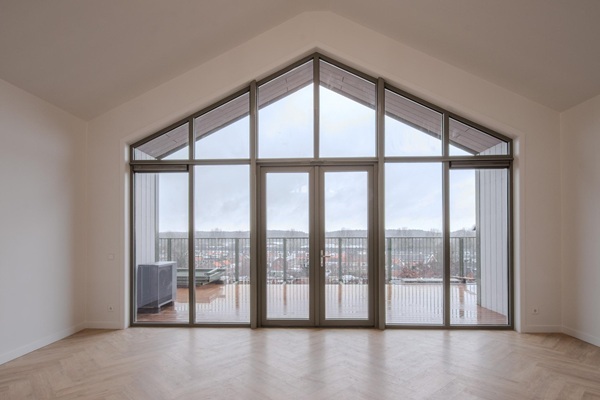 Indeling Via de centrale entree op de begane grond brengt de lift je naar het dakniveau, waar je uitkomt op het gezamelijke dakterras en de voordeur van de woning. Binnen leidt de hal naar twee slaapkamers, de badkamer, een separaat toilet, een inpandige berging en de lichte woonkamer met open keuken. Vanuit de woonkamer heb je direct toegang tot het dakterras. De afwerking is hoogwaardig. De appartementen zijn voorzien van een PVC-visgraatvloer met vloerverwarming in alle ruimtes. De keuken is compleet uitgerust met inbouwapparatuur: kookplaat, combioven, vaatwasser, afzuigkap en koel-vriescombinatie.De badkamer is stijlvol uitgevoerd met een ligbad, inloopdouche, dubbele wastafel en handdoekradiator. Extra opbergruimte is aanwezig in de berging én op de vliering, waar ook de installaties zijn geplaatst.
