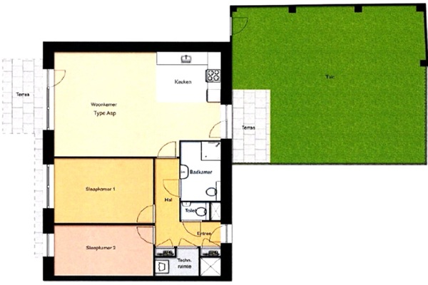 Indeling appartement: Vanuit de hal loop je tegen de eerste slaapkamer aan van circa 10 m2. De tweede slaapkamer bevindt zich daarnaast van circa 14 m2. Aan de rechterkant vind je de badkamer, tevens is er een separaat toilet aanwezig. De woonkamer van circa 40 m2 beschikt over een open keuken voorzien van alle benodigde inbouwapparatuur. Vanuit de woonkamer is de toegang naar de tuin van circa 45 m2.
