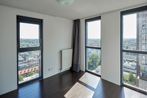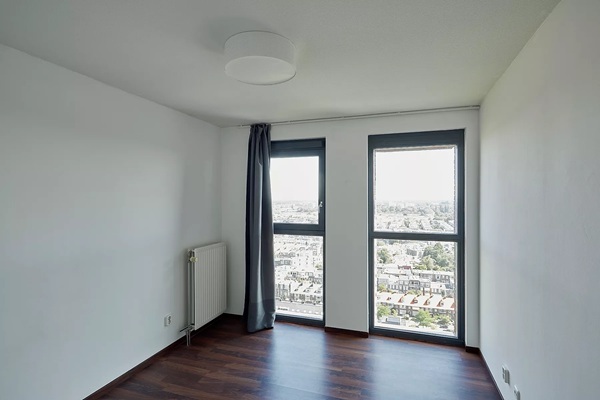 De woning beschikt over twee royale slaapkamers en een complete badkamer met douche, ligbad, wastafel en een tweede toilet. Daarnaast is er een praktische inpandige berging aanwezig. Het grote terras vormt een heerlijk verlengstuk van de woning: een fijne plek om te ontspannen, te ontbijten in de zon of ’s avonds te genieten van de skyline.