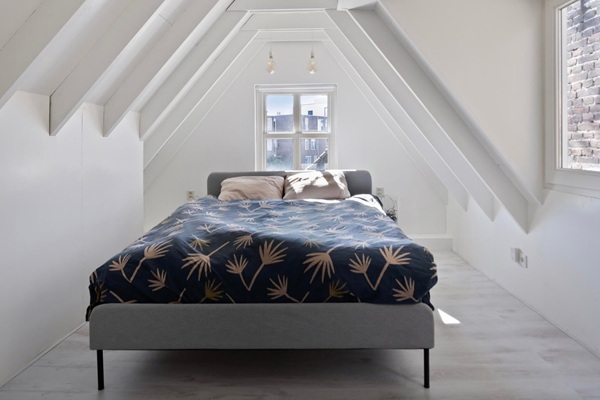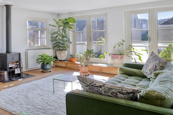 Entree met trapopgang. Eerste verdieping Op de eerste verdieping vinden we de royale en sfeervolle woonkamer met open keuken. De woonkamer heeft veel natuurlijk lichtinval door de twee grote, dubbele openslaande deuren naar het royale dakterras aan de achterzijde van de woning. De ruime keuken is voorzien van diverse apparatuur zoals een koelkast, vriezer, vaatwasser en oven. Verder op de eerste verdieping de eerste badkamer met toilet, wastafel en douche. In deze badkamer zijn ook de wasmachine en droger geplaatst. Naast de badkamer is een ruime bijkeuken/ berging gesitueerd. Middels de vaste trap op de eerste verdieping komen we uit op de tweede verdieping. Tweede verdieping Ruime tweede etage met twee ruime slaapkamers. De hoofdslaapkamer is aan de achterzijde van het pand gelegen en deze is voorzien van een tweepersoonsbed. De kamer aan de voorzijde van het pand is ingericht als werkkamer. Het zijn fijne lichte, en door de balklagen, sfeervolle slaapkamers. Naast de twee slaapkamers vinden we op deze etage ook de tweede badkamer met ligbad, tweede toilet en wastafel en de CV-ruimte.