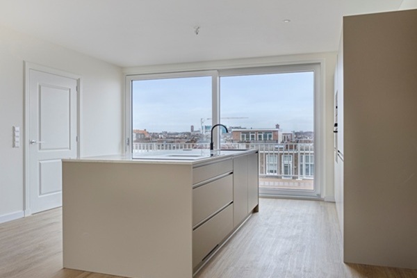 Het appartement beschikt over een ruime en lichte woonkamer met een moderne open keuken. De keuken is uitgevoerd met een stijlvol kookeiland en een praktische ontbijtbar en is voorzien van luxe inbouwapparatuur, waaronder een inductiekookplaat, een hoogwaardige vaatwasser, en een grote koelkast met losse vriezer. Dankzij de grote raampartij aan de voorzijde heeft de woonkamer veel natuurlijk licht en een prettig weids uitzicht over de Schenkkade en de aangrenzende groenstrook. Aan de achterzijde van de woning bevindt zich een schuifpui die toegang geeft tot het royale dakterras. Vanaf dit terras geniet u van een weids uitzicht over de skyline van Den Haag – een ideale plek om te ontspannen of om op een mooie dag buiten te zitten. Het dakterras is perfect georiënteerd: op zonnige dagen heb je hier de hele middag en avondzon! De woning beschikt daarnaast over een ruime slaapkamer en een moderne badkamer met een inloopdouche, wastafel en handdoekradiator. Vanuit de ruime hal zijn tevens een apart toilet en een praktische kast met boiler en opstelplaats voor wasmachine en droger bereikbaar. Tot slot is er nog een separate bergkast aanwezig, die extra opbergruimte biedt.