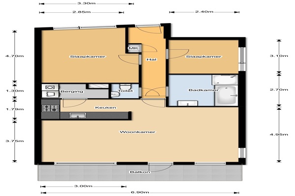 Indeling: Entree met garderobe, meterkast en toilet. Vanuit hier toegang tot alle vertrekken in de woning. De woonkamer is erg licht door de grote raampartijen aan zowel de zijkant als de achterzijde. Via openslaande deur is het ruime balkon te bereiken. Op de vloer ligt een laminaatvloer met V-groef. Er is een halfopen hoek opgestelde keuken met veel kastruimte en apparatuur (koelkast, vriezer, combimagnetron, vaatwasser, keramische kookplaat en afzuigkap). Er is een berging waar zich de aansluiting voor wasmachine en droger en de Cv-ketel zich bevinden. De beide slaapkamer zijn gesitueerd aan de voorzijde van het appartement. De badkamer heeft een douchecabine met thermostaatkraan, ligbad en wastafel. De wanden zijn tot aan het plafond betegeld. Het balkon ligt op het zuiden. Het balkon strekt zich uit over de gehele breedte van het appartement zodat de hele dag van de zon kan worden genoten. In de onderbouw bevindt zich de berging en de parkeerkelder.
