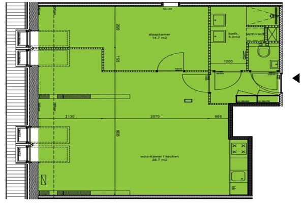 Indeling: Begane grond: Centrale entree. Vervolgens ontvangst hal met toegang tot de parkeergarage en fietsenstalling. Hier zit ook de trap en lift naar de hoger gelegen etage. 1e etage Toegang tot de woning. Hal met deuren naar alle ruimtes. Separaat toilet. Badkamer voorzien van een dubbele wastafel en inloop douche. Luxe radiator en aansluiting voor de wasmachine. De badkamer is volledig betegeld. Ruime woonkamer met grote kantel ramen en veel licht. De keuken is open en voorzien van de nodige inbouwapparatuur; afzuigkap, inductie kookplaat, koelkast met vriesvakje, vaatwasser en combi oven-magnetron. De slaapkamer is met 15m2 een ruime kamer met voldoende ruimte voor een bed en grote kast.