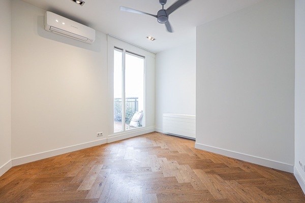 Indeling: Aan de achterzijde van het appartement bevinden zich de woonkamer en de open keuken. Deze ruimte is zeer licht dankzij de grote ramen die de hele ruimte omringen. Voor extra comfort is het hele appartement voorzien van airconditioning. De keuken is uitgerust met alle moderne apparatuur, zoals een afzuigkap, vaatwasser, grote ingebouwde koel-vriescombinatie en veel opbergruimte. Vanuit de woonkamer is er toegang tot het balkon dat aan twee zijden van het appartement is gelegen en voorzien is van design buitenverlichting. Vanaf hier heeft u een fantastisch uitzicht over het centrum van Amsterdam. Twee gelijkwaardige, ruime slaapkamers van circa 12 m². De moderne badkamer is voorzien van een inloopdouche met twee douchekoppen, een handdoekradiator en een dubbele wastafel. In de hal: apart toilet en een berging met wasmachine en droger. Niet geschikt voor studenten/gedeelde huisvesting.
