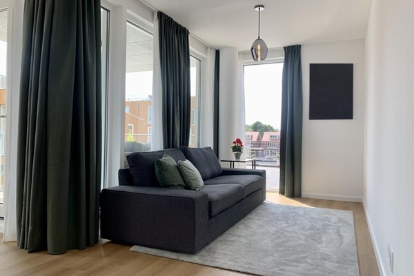 Dit luxe en comfortabele appartement bevindt zich op de eerste verdieping van het moderne en duurzame complex ‘De Veerplaats’. Onder het gebouw beschik je over een eigen parkeerplaats en een gemeenschappelijke fietsenberging. Met de lift – of de trap voor wie dat prettig vindt – bereik je eenvoudig de woning. Achter de voordeur voelt het direct als thuiskomen. De lichte hal geeft toegang tot alle vertrekken en leidt je naar de royale woonkamer met open leefkeuken, gelegen op de hoek van het gebouw. Dankzij de grote ramen tot aan de grond geniet je hier van een prachtige lichtinval en een vrij uitzicht over het vaarwater van de Oude Rijn. De luxe keuken is voorzien van diverse inbouwapparatuur, waaronder een afwasmachine, oven en koelkast met vriesvak, en biedt volop opbergruimte. De grote ronde eettafel vormt een centrale plek in huis en leent zich perfect voor lange, gezellige diners. Grenzend aan de woonkamer bevindt zich het overdekte terras, waar je het hele jaar door comfortabel op de loungebank kunt zitten met uitzicht op de gemeenschappelijke tuin. Het appartement beschikt over twee goed bemeten slaapkamers. De hoofdslaapkamer is ingericht met een tweepersoonsbed en een ruime inbouwkast. De tweede kamer is voorzien van een hoogslaper en een praktische werkplek, ideaal als logeer-, kinder- of werkkamer. De moderne badkamer is uitgevoerd met een inloopdouche en een wastafelmeubel, en daarnaast is er een separate toiletruimte aanwezig. Extra praktisch is de inpandige berging, waar zich niet alleen veel opslagruimte bevindt, maar ook de wasmachine en droger zijn opgesteld.