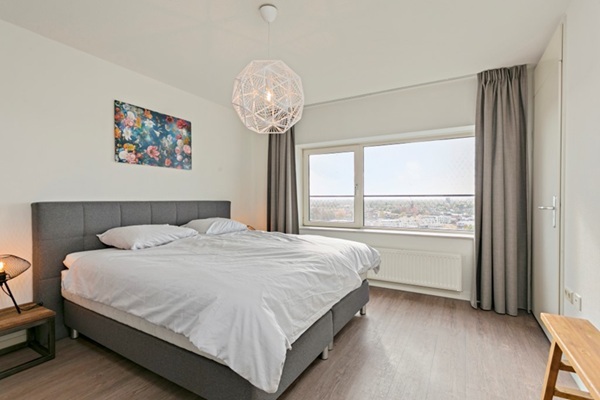 Indeling Begane grond Representatieve en royale entree met stijlvolle afwerking. Het gebouw beschikt over toegangsbeveiliging via videofoon, een nette ontvangsthal en directe toegang tot de liften, het trappenhuis en de afgesloten parkeergarage. 14e verdieping Bij binnenkomst treft u een ruime entree met garderobe en separaat toilet. De royale woonkamer is smaakvol ingericht met een comfortabele zithoek en een ruime eethoek. Dankzij de grote raampartijen geniet u hier van een indrukwekkend uitzicht over Eindhoven. De luxe halfopen keuken is volledig uitgerust met hoogwaardige inbouwapparatuur, waaronder een vaatwasser, oven-grill-magnetron, gaskookplaat en een koel-vriescombinatie. Aangrenzend bevindt zich een praktische berging met wasmachine en droger. Het appartement beschikt over twee slaapkamers: Een ruime hoofdslaapkamer met een queen-size tweepersoonsbed en een tweede slaapkamer met een comfortabel eenpersoonsbed De luxe badkamer is compleet uitgevoerd met een separate douchecabine en vaste wastafels.