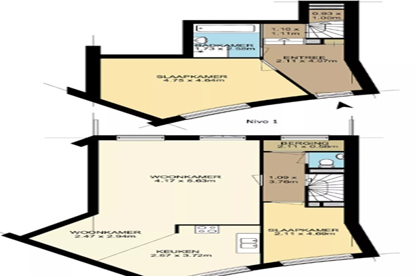 Op de eerste woonlaag kom je binnen in de ruime hal. Hier bevinden zich de twee slaapkamers, beide met een prettig formaat en geschikt als master bedroom, werkruimte of logeerkamer. De badkamer heeft een frisse, eigentijdse uitstraling en is voorzien van een brede wastafel, een ruime inloopdouche en een toilet. Via de trap bereik je de tweede woonlaag. Hier vind je een extra toilet, een praktische berging en de ruime, lichte living. Dankzij de grote ramen voelt de woonkamer open en uitnodigend aan. Vanuit de living stap je zo het balkon op, een fijne plek om buiten te zitten. De open keuken grenst direct aan de woonkamer en is uitgerust met een koel-vriescombinatie, combi-oven/magnetron, vaatwasser, kookplaat en afzuigkap