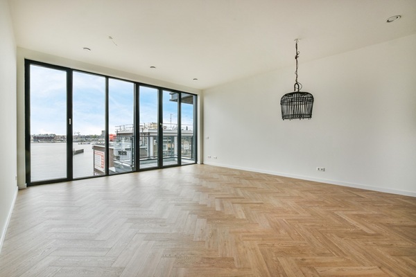 INDELING: Ruime en veilige entree met lift naar het appartement. Toegang tot het appartement, de hal, aan de rechterkant de ruime slaapkamer, apart toilet, moderne badkamer met wastafel, handdoekradiator en inloopdouche. Spectaculair gelegen woonkamer met een ongeëvenaard uitzicht over het water en de stad Amsterdam. De woonkamer heeft een moderne keuken met alle gewenste inbouwapparatuur. Aan de voorzijde is er een ruim balkon dat de hele dag in de zon ligt. Het gehele appartement is voorzien van een prachtige visgraatvloer. In de kelder bevindt zich de privé-berging en tevens de gemeenschappelijke fietsen-/scooterstalling. - Niet geschikt voor studenten