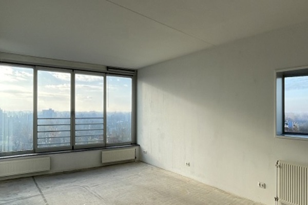 Indeling: Begane grond: Centrale entree met lift en toegang tot (fietsen) bergingen. 8e verdieping: Entree, toilet met fontein, riante lichte woonkamer met fantastisch uitzicht door de vele ramen en luxe open keuken voorzien van inbouwapparatuur (vaatwasser, gaskookplaat, afzuigkap en koelkast). Badkamer met douche, wastafel en toilet, 1 slaapkamer en 1 logeer/studeerkamer, inpandige berging met wasmachine aansluiting en cv- ketel.