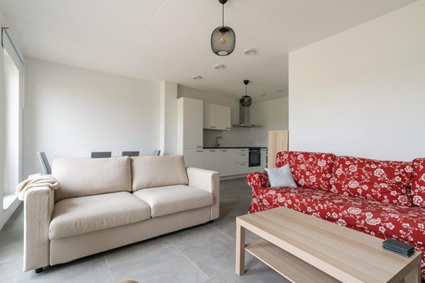 Indeling: Entree in de centrale hal, trap of lift naar de eerste verdieping, entree van het appartement in de gang met meterkast, loshangend toilet met fonteintje, berging met opstelplaats warmtepomp en boiler, vaste kast met was-/droogcombinatie. Lichte en ruime woonkamer met een vrij en levendig uitzicht over gracht en groenvoorziening (in aanleg). Moderne open keuken met oven/magnetron, inductie kookplaat, vaatwasser, koel-/vriescombinatie en afzuigkap. Aan de woonkamer grenzende ruime slaapkamer toegang tot de moderne badkamer met wastafel en inloopdouche. De slaapkamer heeft een schuifpui naar het terras. – Te huur voor maximaal 2 personen, geen studenten of woningdelers