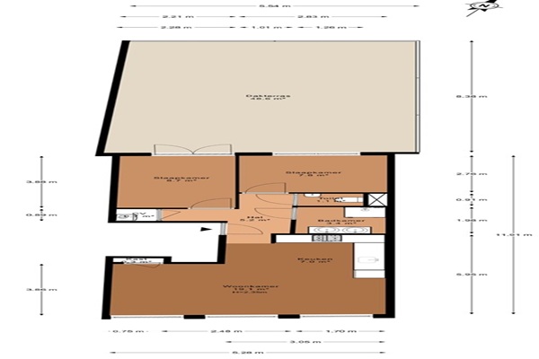 INDELING Via het gemeenschappelijke trappenhuis bereikt u de woning op de eerste verdieping. Bij binnenkomst komt u in de hal die toegang geeft tot alle vertrekken. De lichte woonkamer bevindt zich aan de voorzijde een kenmerkt zich door de grote ramen die zorgen voor een prettige hoeveelheid daglicht. Hier is voldoende ruimte voor het creëren van een comfortabele zit- en eethoek. De open keuken is eveneens aan de voorzijde gelegen en voorzien van diverse inbouwapparatuur en voldoende opbergruimte. Aan de rustige achterzijde van de woning bevinden zich de twee slaapkamers. Vanuit één van de slaapkamers heeft u direct toegang tot het royale dakterras van ca. 49 m², een heerlijke plek om buiten te genieten. De moderne badkamer is centraal in de woning gelegen en voorzien van een inloopdouche en dubbele wastafel. Daarnaast beschikt het appartement over een separaat toilet en een praktische wasruimte.