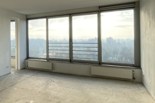 Indeling: Begane grond: Centrale entree met lift en toegang tot (fietsen) bergingen. 8e verdieping: Entree, toilet met fontein, riante lichte woonkamer met fantastisch uitzicht door de vele ramen en luxe open keuken voorzien van inbouwapparatuur (vaatwasser, gaskookplaat, afzuigkap en koelkast). Badkamer met douche, wastafel en toilet, 1 slaapkamer en 1 logeer/studeerkamer, inpandige berging met wasmachine aansluiting en cv- ketel.