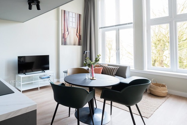 De moderne, open keuken is ideaal voor het bereiden van uw favoriete maaltijden terwijl u in de woonkamer met de gasten bezig blijft. Hij heeft een strak donker design met een contrasterend wit aanrechtblad, compleet met inductiekookplaat, koelkast met vriesvak, vaatwasser en afzuigkap. De ronde eettafel maximaliseert de ruimte, waardoor hij perfect is voor bijeenkomsten. Boven biedt de mezzanine een speciale studeerruimte, terwijl de keldersuite de gezellige slaapkamer herbergt, bereikbaar via een trap. De privébadkamer is een rustig toevluchtsoord met een grote douche met glazen deur, een wastafel en rustgevende beige tegels. Ideaal voor (uitwisselings)studenten, expats en professionals die tijdelijk woonruimte nodig hebben vanwege woningrenovatie, verkoop, relatiewijzigingen, stages of kortdurende werkopdrachten in of rond Nijmegen.