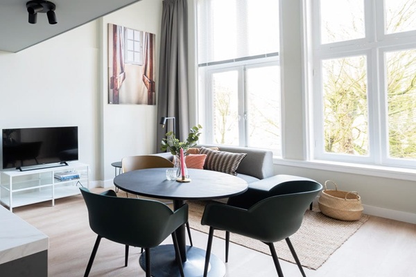 De moderne, open keuken is ideaal voor het bereiden van uw favoriete maaltijden terwijl u in de woonkamer met de gasten bezig blijft. Hij heeft een strak donker design met een contrasterend wit aanrechtblad, compleet met inductiekookplaat, koelkast met vriesvak, vaatwasser en afzuigkap. De ronde eettafel maximaliseert de ruimte, waardoor hij perfect is voor bijeenkomsten. Boven biedt de mezzanine een speciale studeerruimte, terwijl de keldersuite de gezellige slaapkamer herbergt, bereikbaar via een trap. De privébadkamer is een rustig toevluchtsoord met een grote douche met glazen deur, een wastafel en rustgevende beige tegels. Ideaal voor (uitwisselings)studenten, expats en professionals die tijdelijk woonruimte nodig hebben vanwege woningrenovatie, verkoop, relatiewijzigingen, stages of kortdurende werkopdrachten in of rond Nijmegen.