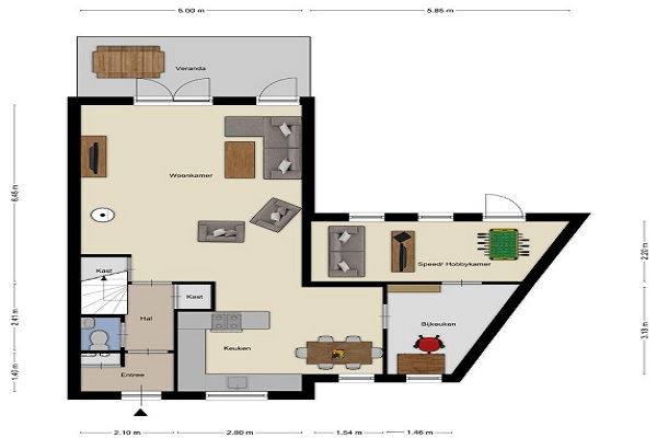 Hal met garderobe en meterkast. Aan de voorzijde is de keuken gelegen. De hoekvormige keuken heeft is luxe van uitvoering en beschikt over een vaatwasser, 4-pits gaskookplaat, afzuigkap, oven, magnetron en koelkast. Aansluitend aan de keuken is een ruimte gelegen welke perfect is voor een thuiswerkplek. Hier is tevens een ruimte gelegen met de aansluitingen voor de wasmachine. De woonkamer, aan de achterzijde gelegen, heeft zicht op de achtertuin. De woonkamer geniet genoeg licht door de grote raampartijen. Het portaal dat bereikbaar is vanuit de woonkamer heeft toegang tot de woonkamer, de geheel betegelde toiletruimte met wandcloset en fonteintje en de trapopgang naar de eerste verdieping. Overloop met toegang tot de 3 ruime slaapkamers, badkamer. De geheel betegelde badkamer is voorzien van een douche, vaste wastafel en mechanische ventilatie. Deze verdieping is voorzien van een zeer ruime extra slaapkamer. De ruime achtertuin is gelegen op het zuidwesten en voorzien van sierbestrating, borders, tuinhuis en een terras met overkapping ter plaatse van de achtergevel. Het terras is voorzien van een overkapping met inbouwverlichting. De tuin is op zonzijde gelegen en biedt toegang tot zowel de woonkamer als de extra kamer.