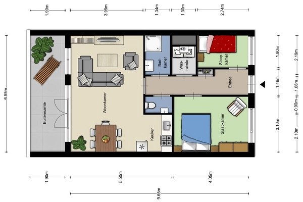 Indeling Centrale entree met bellentableau, brievenbussen en toegang tot de trappen, lift en gezamenlijke binnenplaats. Toegang tot het appartement. Hal die toegang biedt tot de slaapkamers, badkamer en woonkamer. Apart toilet met hangend closet en fonteintje. De ruime woonkamer is voorzien van fraaie hout-look vloer. Toegang tot het ruime balkon. De grote ramen zorgen voor veel lichtinval. Volledige nieuwe keuken voorzien van gaskookplaat, koel-vriescombinatie, combi-magnetron, vaatwasser en volop kastruimte. Via de hal bereikt u de eerste slaapkamer welke voldoende ruimte biedt aan een 2-persoonsbed en een grote kledingskast. Tweede slaapkamer. Nette badkamer met inloopdouche en wastafel. Ruime bergkamer met aansluiting voor de wasapparatuur. Het appartement is voorzien van een berging en eigen parkeerplaats.
