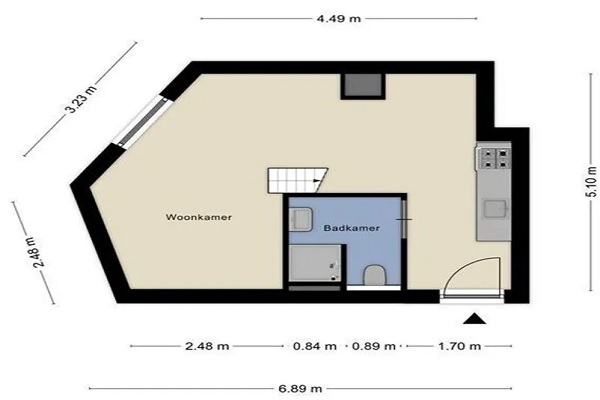 INDELING Statige entree met de nodige grandeur geeft toegang tot het ruime trappenhuis. Eigen voordeur geeft toegang tot het warm en sfeervol, bestaande uit een woonkamer met open keuken in hoekopstelling, badkamer met schuifdeur en in een nis staat de luxe boxspring met garderobekast. Andere voorzien van bank, bijzettafel, eettafel met 2 stoelen, wandrek, garderobekast, 2 persoons boxspring bed met textielpakket.