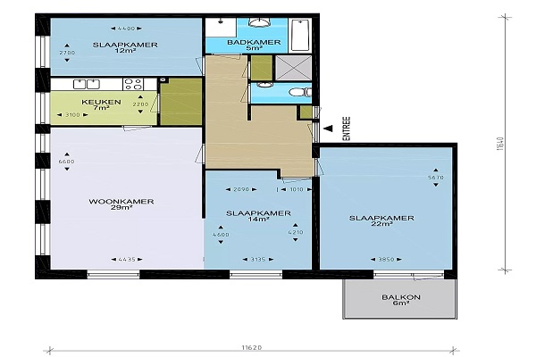4-kamer appartement met een oppervlakte van 108 m². De lichte woonkamer van circa 20 m² vormt het hart van de woning en biedt toegang tot het eerste balkon – ideaal voor een in de ochtend of een frisse avondbries. De open keuken is uitgerust met een inductiekookplaat, koel-vriescombinatie, elektrische oven, spoelbak en afzuigkap. Vanuit de hal bereik je de drie slaapkamers, waarvan de grootste directe toegang heeft tot het tweede balkon. De badkamer is modern ingericht met een inloopdouche, ligbad en wastafel. Het toilet bevindt zich in een aparte ruimte. Praktisch is ook de inpandige berging met aansluiting voor een wasmachine en/of droger – handig én uit het zicht.
