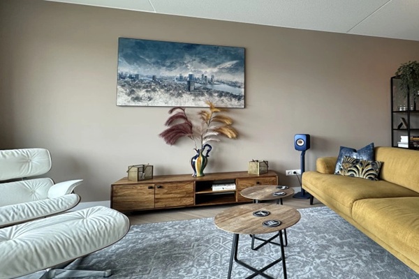 Indeling Entree via een representatieve centrale hal met lift, brievenbussen en bellentableau. De entree van het appartement is op de vijfde verdieping. Je komt het appartement binnen in de hal met separaat toilet, garderobe en toegang tot alle vertrekken. De woonkamer is stijlvol ingericht met een comfortabele hoekbank, design fauteuil, modern TV-meubel en een warme PVC vloer in visgraatmotief. De open keuken is uitgerust met inbouwapparatuur, waaronder een koelkast, vriezer, combi-oven, vaatwasser, inductiekookplaat, en een stijlvolle eethoek met ronde tafel en vier stoelen. Via de schuifpui in de woonkamer bereikt u het overdekte balkon met uitzicht over het water – een plek waar je in alle rust kunt genieten van de zonsondergang. De hoofdslaapkamer beschikt over een luxe boxspring (tweepersoonsbed), twee nachtkastjes en een ruime kledingkast. De tweede slaapkamer is momenteel ingericht als werkkamer met een strak bureau, ergonomische bureaustoel, garderobekast en veel daglicht – ideaal voor thuiswerken. De badkamer is modern en voorzien van een ruime inloopdouche, dubbele wastafel met spiegelkast en strak tegelwerk.