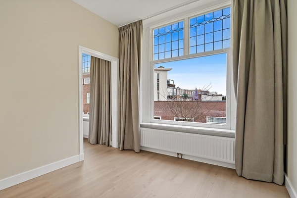Indeling: Entree op straatniveau, trap naar 1e etage; Overloop, Gang, Woon-/eetkamer met half open keuken voorzien van koel-/vries combinatie, oven, magnetron, kookplaat, afzuigkap en vaatwasser. Master bedroom aan de achterkant. Toilet, Badkamer met inloopdouche, dubbele wastafel en handdoekradiator. Grote bergkast met aansluiting voor de wasmachine. Twee slaapkamers aan de voorkant. Max. twee studenten/woningdelers;