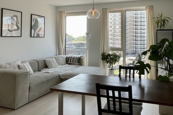 Dit tweekamerappartement (42 m²) bevindt zich op de tweede verdieping. Compact, slim ingedeeld en voorzien van alles wat je nodig hebt. Het appartement beschikt over een slaapkamer van ca. 9 m², een moderne keuken met inductiekookplaat, combi-oven/magnetron, afzuigkap, koel-vriescombinatie en vaatwasser, en een badkamer met wastafel en spiegel, zwevend toilet, handdoekradiator en plafondhoog betegelde wanden.