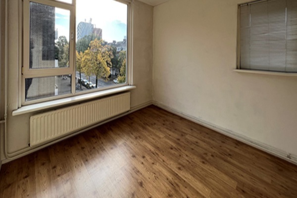 Indeling Afgesloten gezamenlijke entree met bellentableau. Trap naar de vierde etage. Binnenkomst in de hal die toegang geeft tot de diversen vertrekken. De lichte woonkamer is gelegen aan de voorzijde van het appartement. De slaapkamer is via de woonkamer te bereiken en ligt aan de achterzijde van het appartement. Er is ook nog een kleinere kamer, als studeer / werk kamer De keuken is voorzien van een keukenblok en ligt aan de voorzijde van de woning. De volledig betegelde badkamer is voorzien van een inloopdouche en wastafel. • Bewoning enkel voor maximaal een stel, woningdelers zijn niet mogelijk